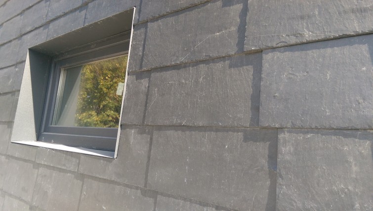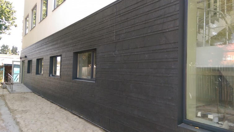 • При монтаже фасада из сланца на этот объекте также использовалась горизонтальная вытянутая кладка.