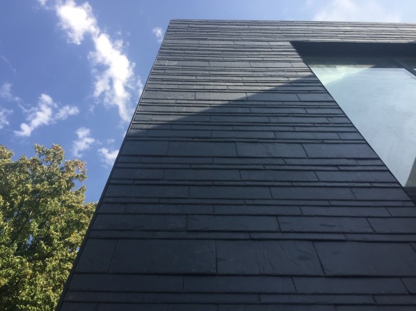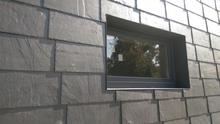 • При монтажі фасаду зі сланцю на цьому об'єкті також використовувалася горизонтальна витягнута кладка.