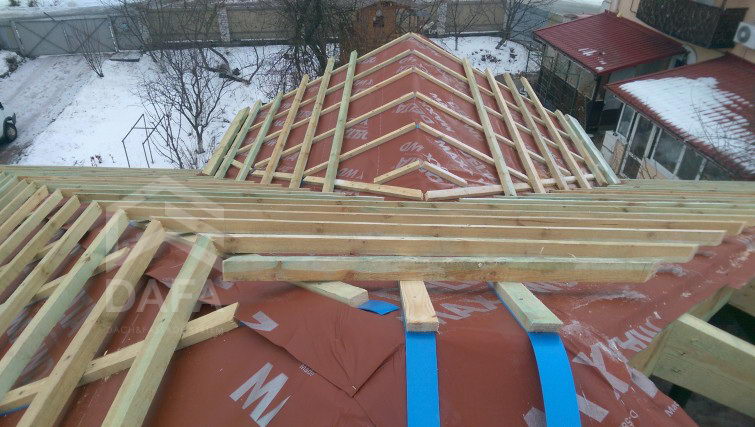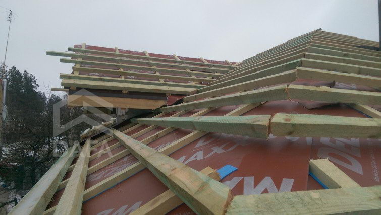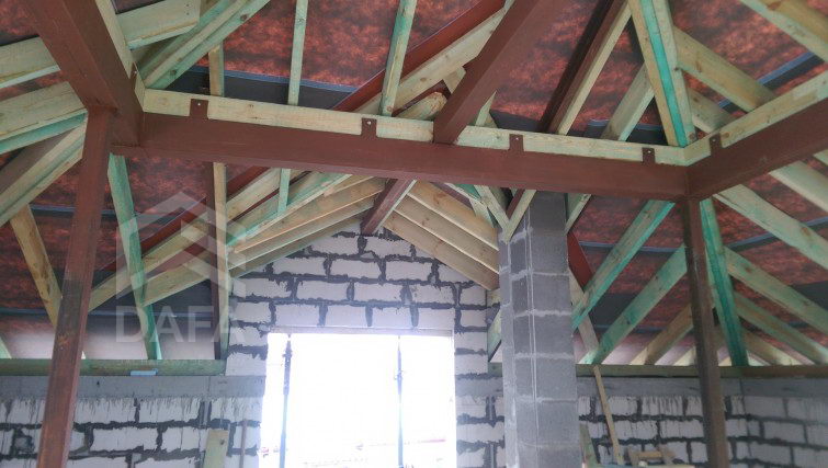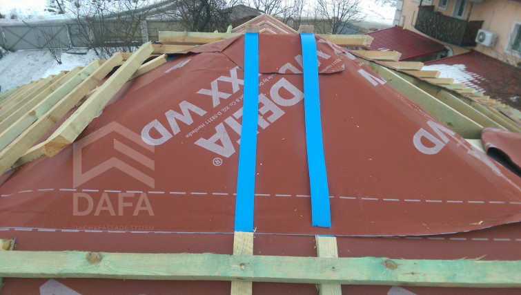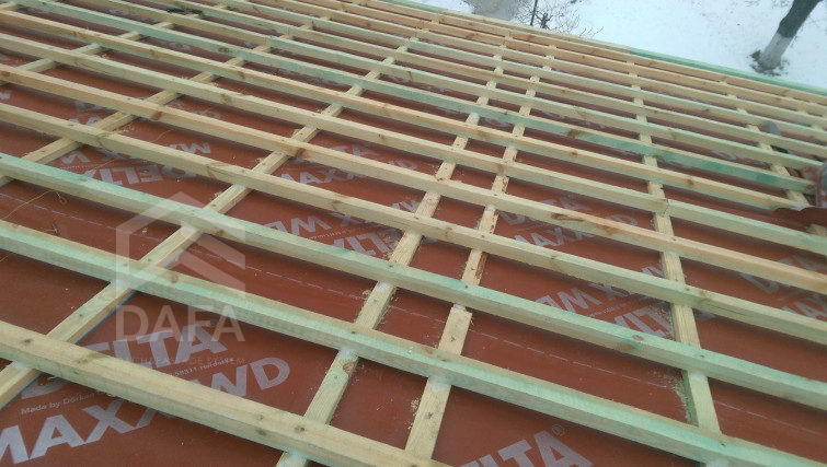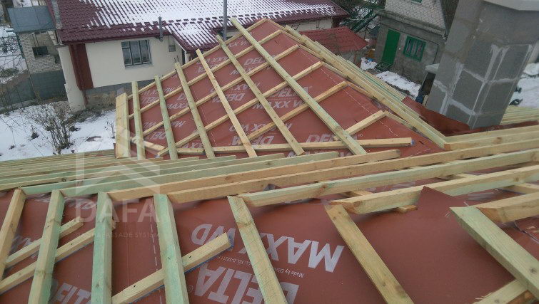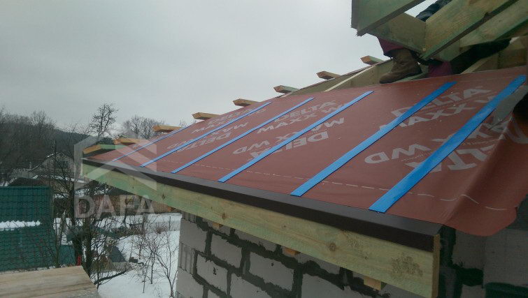 • Гідроізоляція покрівлі - енергозберігаюча диффузионная мембрана Dorken (Німеччина) Delta MAXX WD (190 гр. / М2). Мембрана, яка одночасно має властивості дифузії та антиконденсату, а також має інтегровані дві клейкі смуги, які підвищують теплоеффектівность будинку.