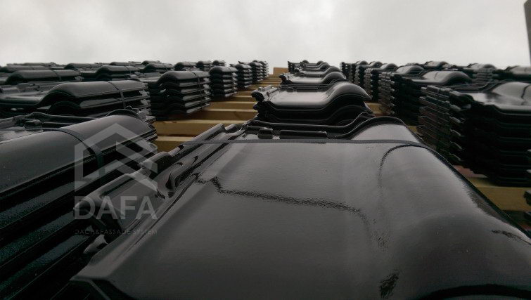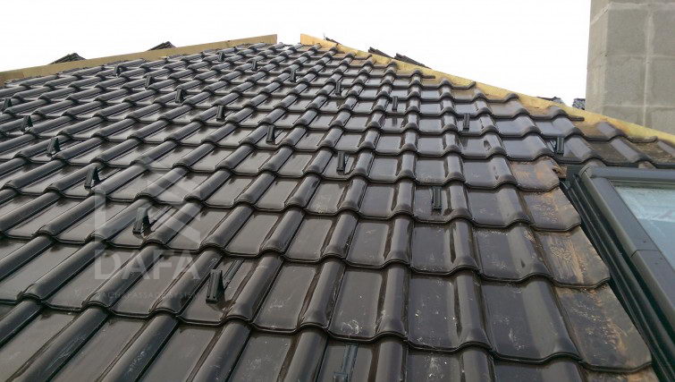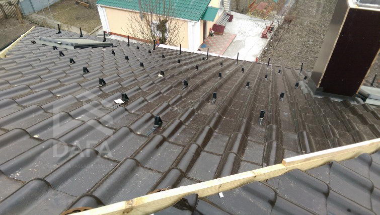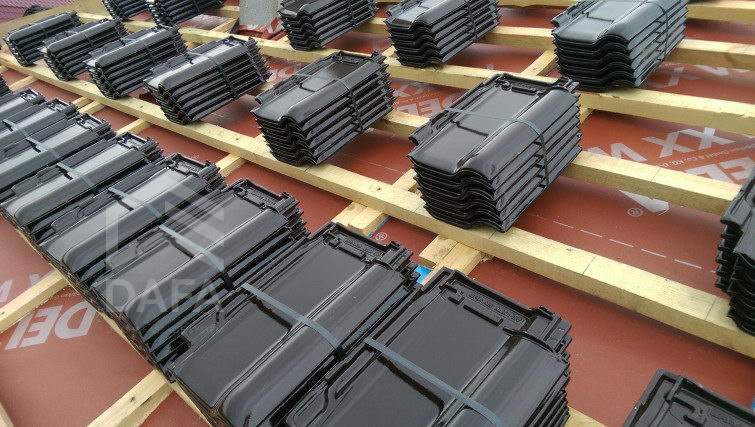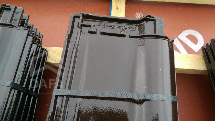 • Керамічна черепиця Braas (Німеччина), модель черепиці Rubin 13 V (12,9 шт. / М2), колір черепиці TEK (темно-коричнева глазур).