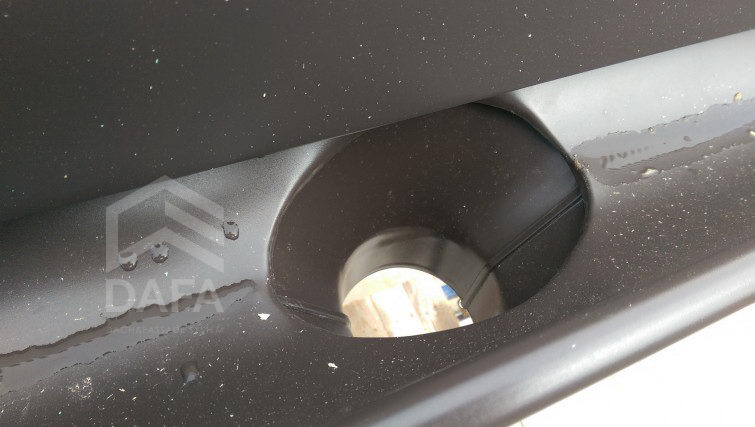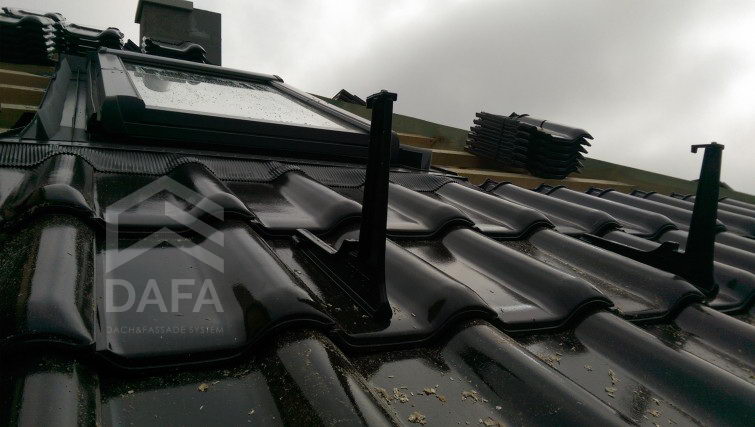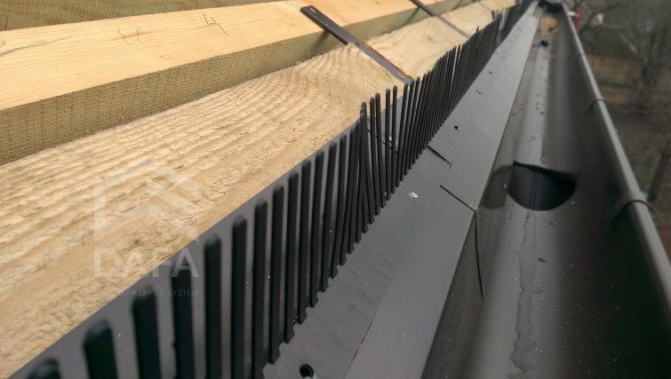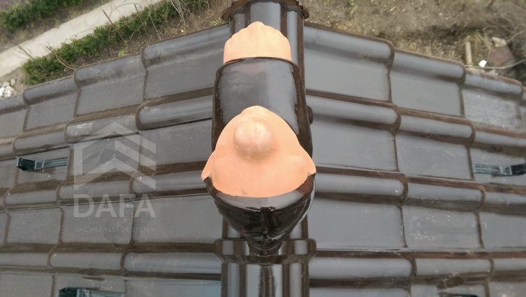 • Металева водостічна система Zambelli (Німеччина), діаметр жолоба 153 мм., колір водостічної системи RAL 8019 (темно-коричневий), матове покриття Robust. Монтаж водостічної системи проводився на довгі тримачі жолоба, для збереження вентиляційного зазору в під покрівельному просторі (рекомендації німецького союзу покрівельників - ZVDH).