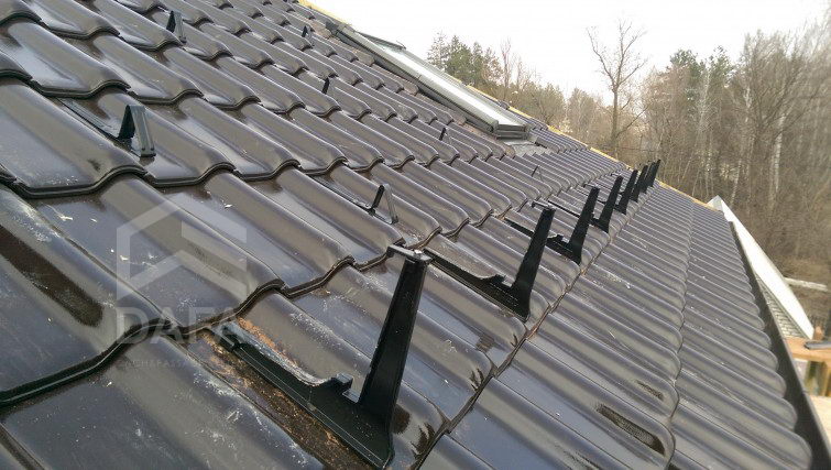 • Алюмінієва система HAUEL (Німеччина), створена для збереження безпеки і снігозатримання снігу на покрівлі, була встановлена відповідно до карти зонування України по сніговим навантаженням. Рядові снеготримачі були встановлені по всьому даху згідно з таблицею, снігозатримуючої решітки по всьому карнизному звиску будинку.