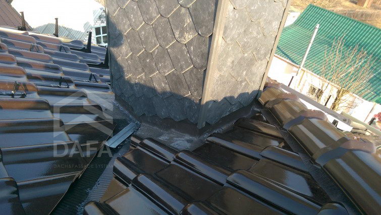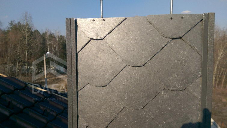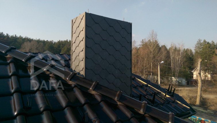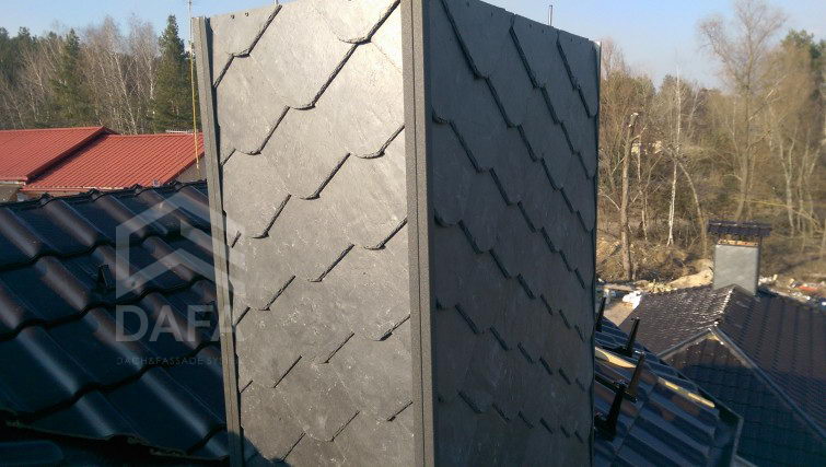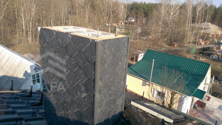• Покрівельний сланець Samaca, модель Samaca 55 UNI (20см.х 20см.), був використаний при обробці димоходів. Сланець універсальний матеріал, який використовують не тільки на покрівлі і фасаді, а й в інтер'єрі. Сланець Самака має найкращими характеристиками, а термін служби складає близько 100-та років.